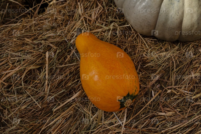 Желтая тыква, отдыхающая в сена рядом с белой тыквой.Сцена захватывает деревенское очарование осенних культур и сезонных декораций, демонстрируя текстуры и цвета осенней продукции