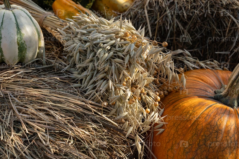 Богатая сцена осеннего урожая с яркими тыквами и высушенным снопом пшеницы на сенаже.Изображение захватывает суть осени своими деревенскими и земными элементами