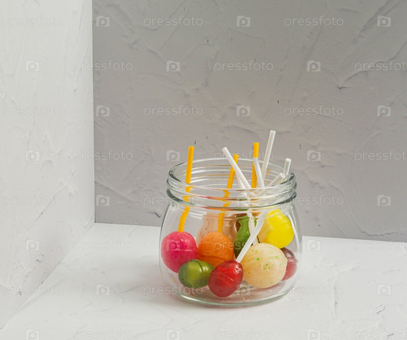 Стеклянная банка содержит многоцветные сферические леденецы. серый фон, трехсторонний