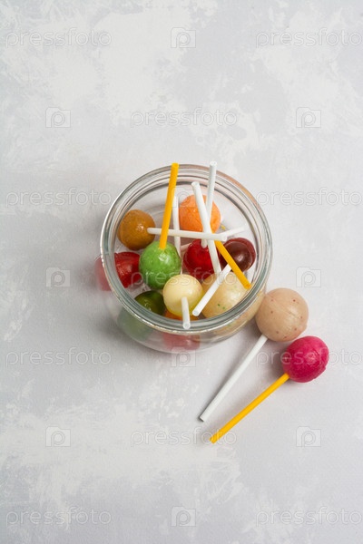 Одна стеклянная банка с многоцветными сферическими леденецами на сером фоне. Вид сверху. Плоский мир