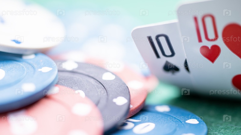 У игрока в покер есть несколько десятков, хорошая комбинация для того, чтобы продолжать играть и увеличивать ставки.Две карты за покерным столом, игрок смотрит на свою руку на фоне чипов