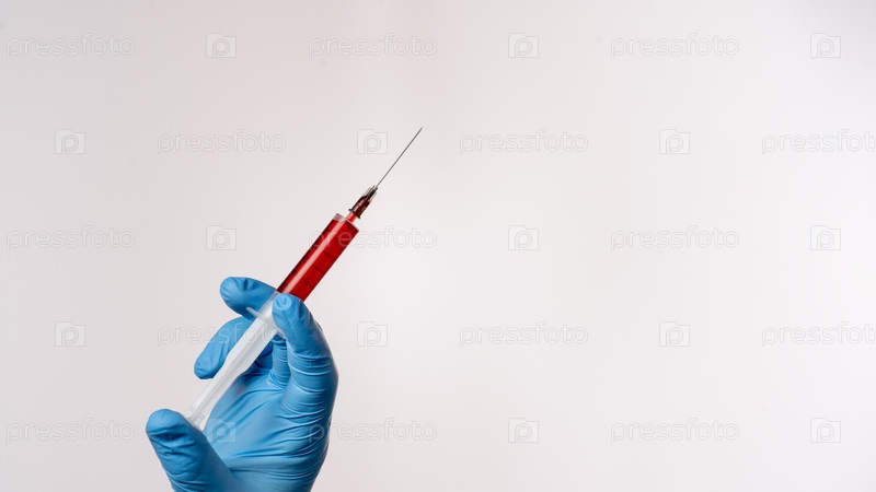 Шприц с красной жидкостью держит человека в синей перчатке