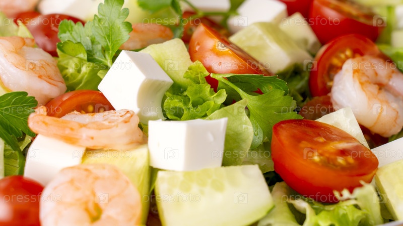 Свежие овощи, сыр фета и креветки делают для здорового питания