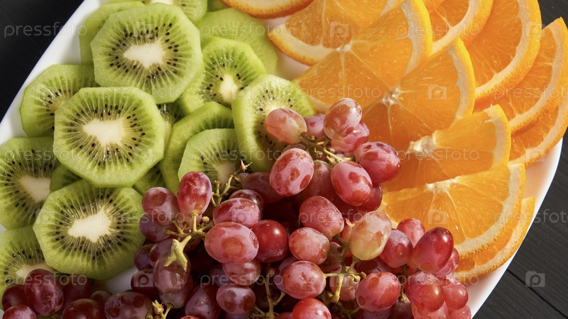 Тарелка фруктов с киви, виноградом и апельсинами