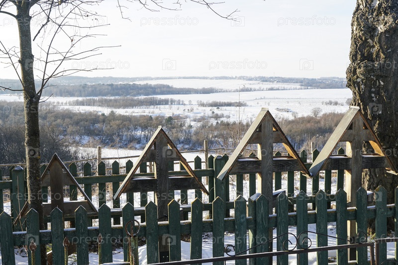 Старые деревянные кресты на деревенском кладбище зимой