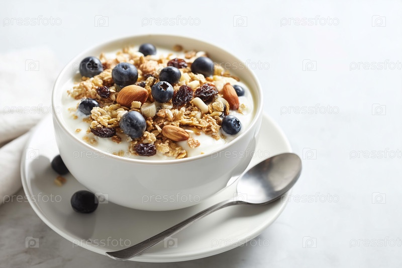 Йогурт с гранолой и чернилами в белом блюде