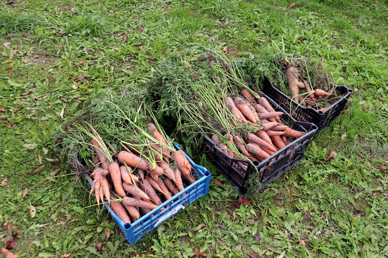 Пластиковые коробки на траве с морковью, собранной в саду, вместе с верхней частью