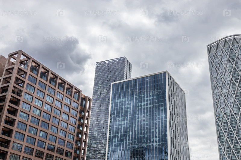 Низкий угол обзора современных офисных башен с отражающими стеклянными фасадами под капризным облачным небом