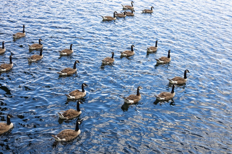 Десятки гусей скользят вместе по спокойной пресной воде, синим волнам и отражениям, образуя мирную сцену природы