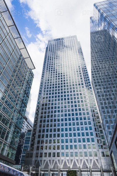 Низкий угол обзора современных стеклянных офисных башен в оживленном деловом районе, голубое небо облаков отражается на гладких фасадах