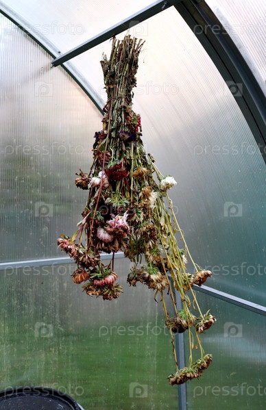 Букет сушеных астеров висит на потолке теплицы в осенний день