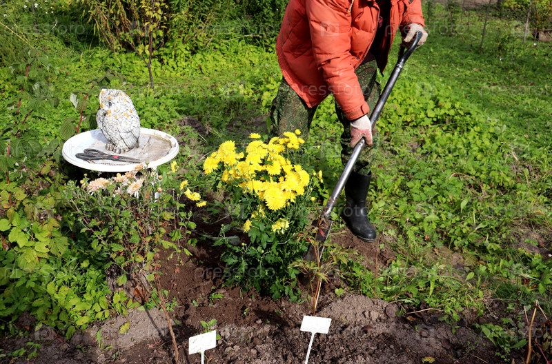 Пенсионерка с лопатой уплотняет землю вокруг куста желтых хризантемов, сажая цветы в сад солнечным осенним днем