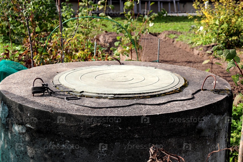 Каменный колодец с закрытой крышкой на фоне сада в солнечный осенний день