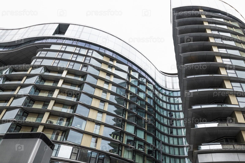 Вид на современные башни с изогнутым стеклянным фасадом и заложенными балконами