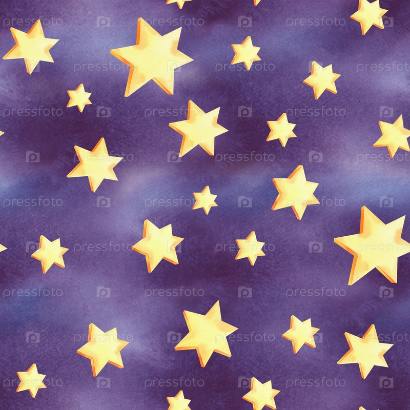 Бесшовный рисунок звезд на фиолетовом фоне. Иллюстрация акварели. Для ткани, обоев, упаковочной бумаги, поздравительных открыток, дизайна, декора и иллюстрации