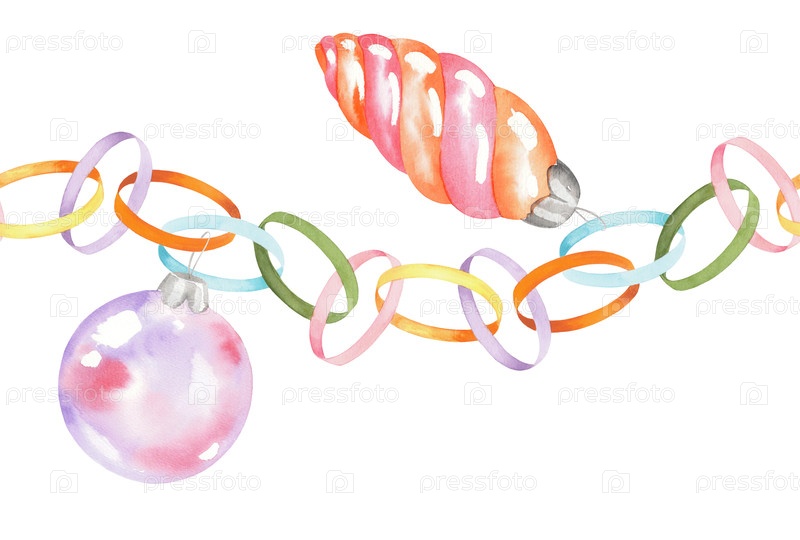 Бесшовная граница бумажной гирлянды и рождественских игрушек. Иллюстрация акварели. Для ткани, обоев, упаковочной бумаги, поздравительных открыток, дизайна, декора и иллюстрации