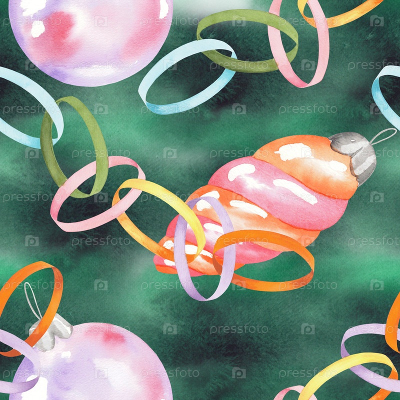 Бесшовный рисунок бумажной гирлянды и рождественских игрушек на зеленом фоне. Иллюстрация акварели. Для ткани, обоев, упаковочной бумаги, поздравительных открыток, дизайна, декора и иллюстрации