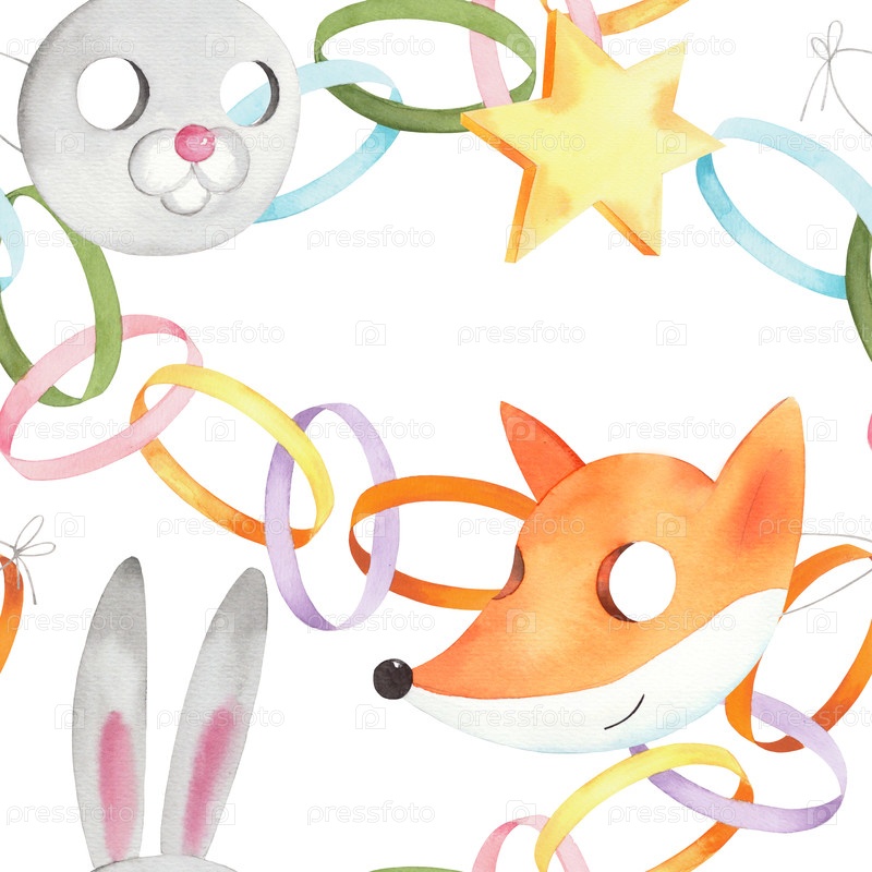Бесшовный акварельный рисунок бумажной гирлянды, лисицы и кроличьей маски и звезд. для ткани, обоев, упаковочной бумаги, поздравительных открыток, дизайна, декора и иллюстрации