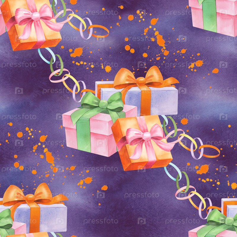 Бесшовный рисунок подарочных коробок, гирлянд и оранжевых плесений акварели. Иллюстрация акварели. Для ткани, обоев, упаковочной бумаги, поздравительных открыток, дизайна, декора и иллюстрации