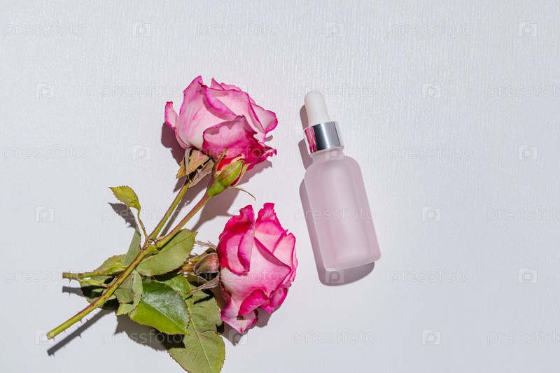 Матовая косметическая бутылка с капельницей лежит на белом фоне с розовыми розами. омолаживающий эффект при уходе за кожей лица и тела