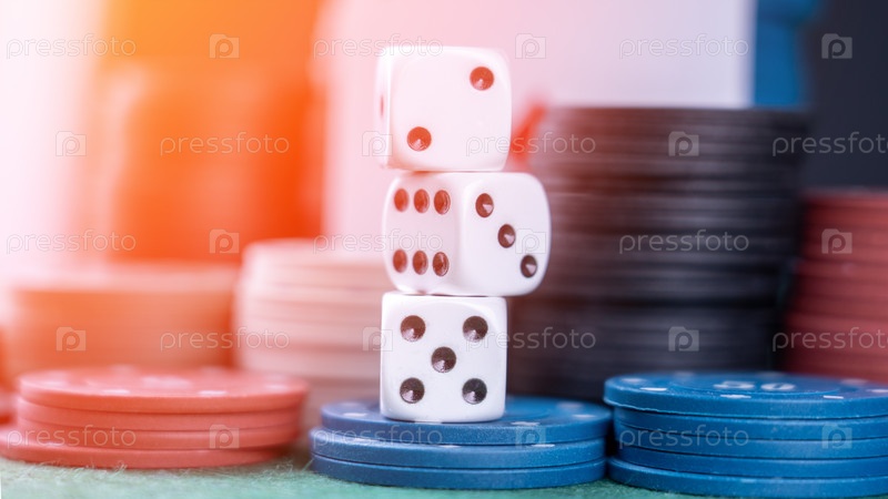 Много костей и фишек для покера на зеленом столе