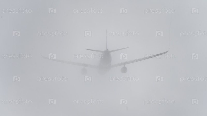 Самолет летит по туманному небу
