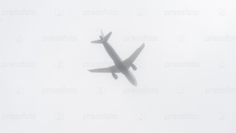 Самолет летит по облачному небу