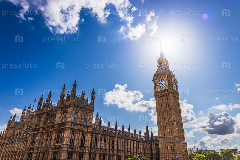 Широкий вид на Биг-Бен и Вестминстерский дворец в Лондоне, с ярким солнцем и облаками