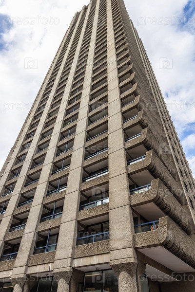 Лондонский брутализм. высота Барбакана с текстурированным бетонным фасадом, сильная симметрия и восходящая перспектива в рассеянные облака