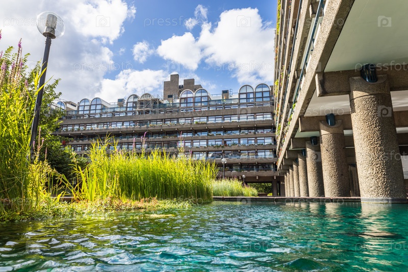 Низкоугольный вид водного сада Barbican Estate в Лондоне, показывающий бруталистский бетон, бирюзовую воду и пышные насаждения под ярким небом