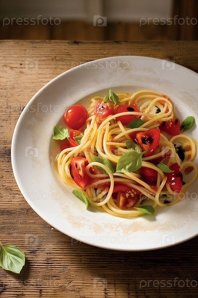 Макаронные спагетти с помидорами вишневыми и базиликом на деревенском столе