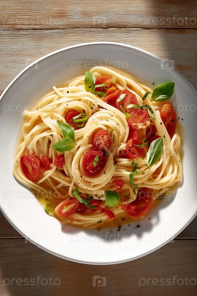 Макаронные спагетти с помидорами вишневыми и базиликом на деревенском столе