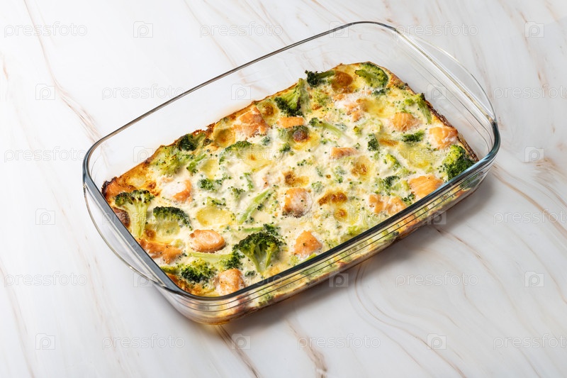 Запеченный лосось и брокколи кастрюля в стеклянной выпечке