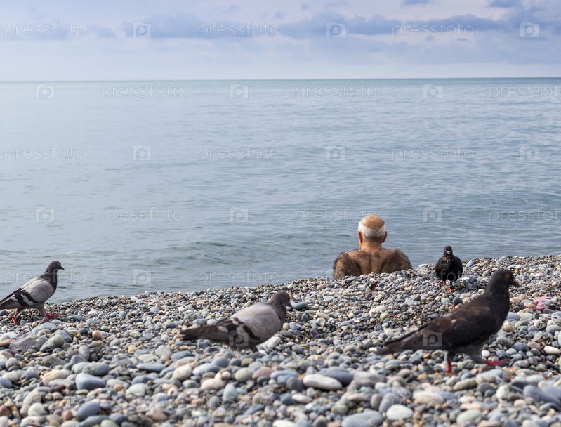 Очень волосатый пожилой мужчина сидит на пляже в окружении голубей