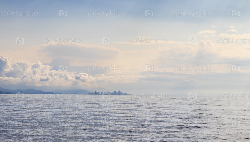 Силуэт современного города вблизи морского горизонта