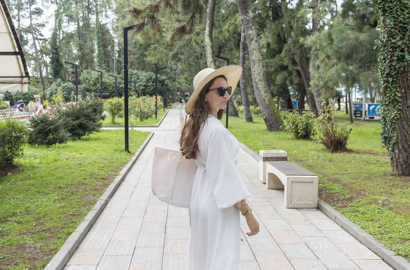 Привлекательная женщина в кремовом белом наряде, соломенной шляпе и солнцезащитных очках в парке для прогулки