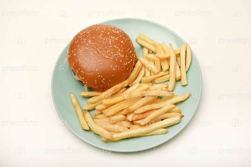 гамбургер с мясом, овощами и картофелями. фаст-фуд. гамбургер на тарелке
