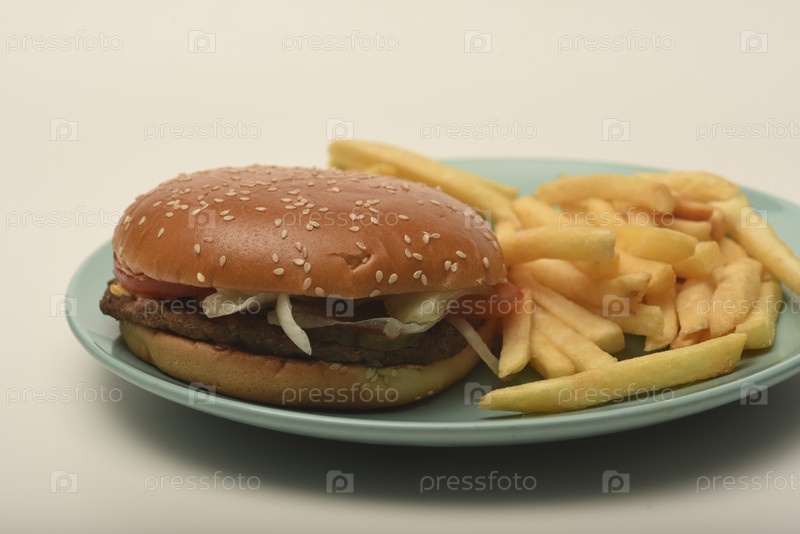 гамбургер с мясом, овощами и картофелями. фаст-фуд. гамбургер на тарелке
