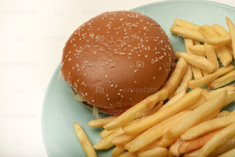 гамбургер с мясом, овощами и картофелями. фаст-фуд. гамбургер на тарелке