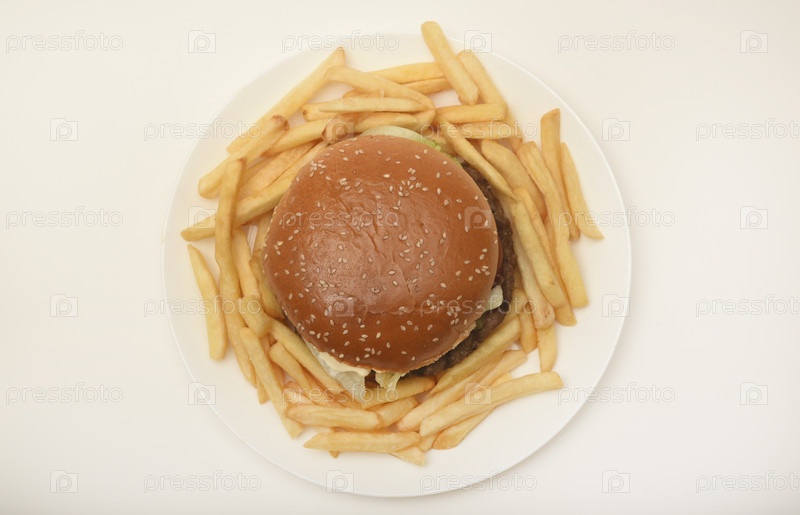 гамбургер с мясом, овощами и картофелями. фаст-фуд. гамбургер на тарелке