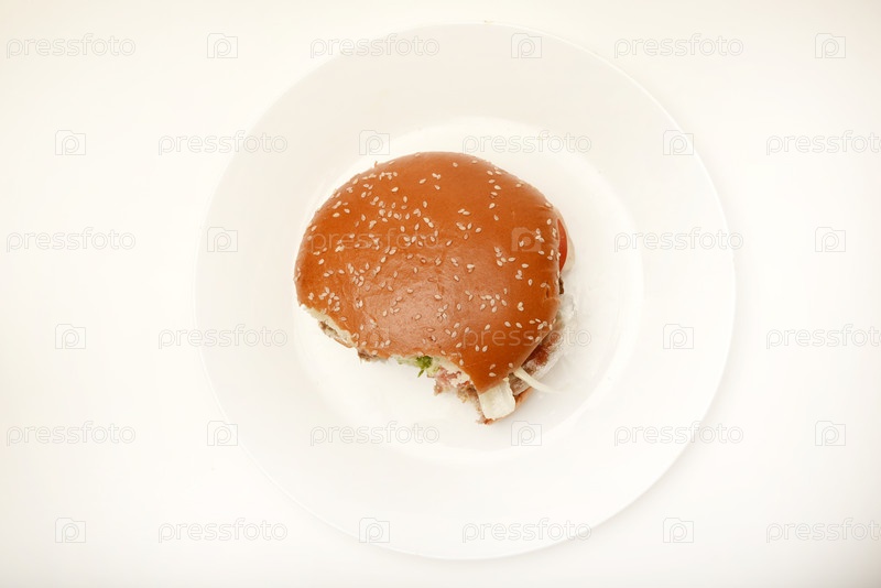 гамбургер с мясом и овощами. фаст-фуд. гамбургер на тарелке. отходы быстрого питания