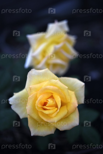 Яркая сочная желтая роза на кусте.Розовый бутон.Желтый цветок в размытом фоне