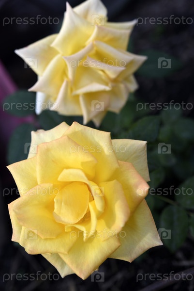 Яркая сочная желтая роза на кусте.Розовый бутон.Желтый цветок в размытом фоне