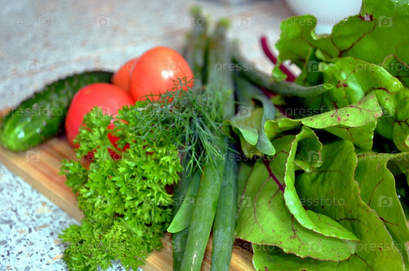 Набор овощей на столе: помидоры, огурцы, зелень