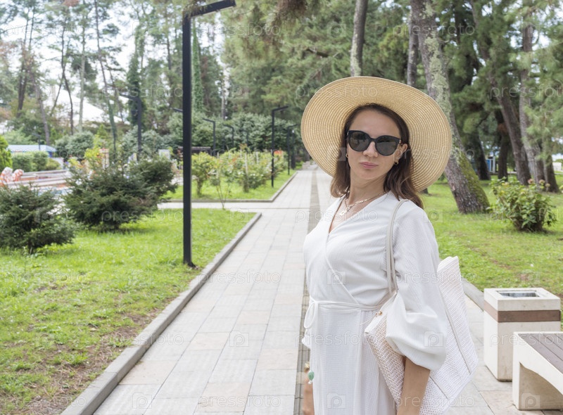 Привлекательная женщина в кремовом белом наряде, соломенной шляпе и солнцезащитных очках в парке для прогулки
