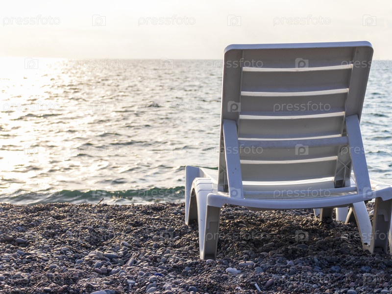 Белый пластиковый patio Chaise Lounge на пляже. снаружи