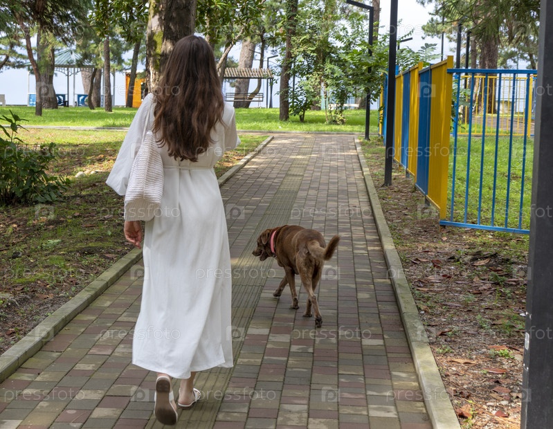 Женщина с длинными коричневыми волосами в белом наряде гуляет со своей собакой в парке