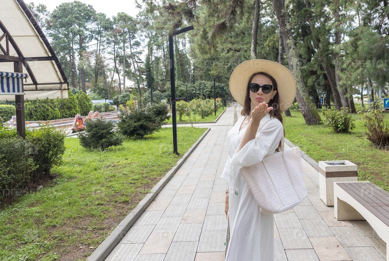 Привлекательная женщина в кремовом белом наряде, соломенной шляпе и солнцезащитных очках в парке для прогулки