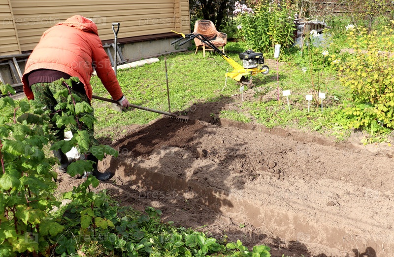 Фермер-мужчина готовит кровать для посадки чеснока, пенсионер плоскит почву в солнечный осенний день