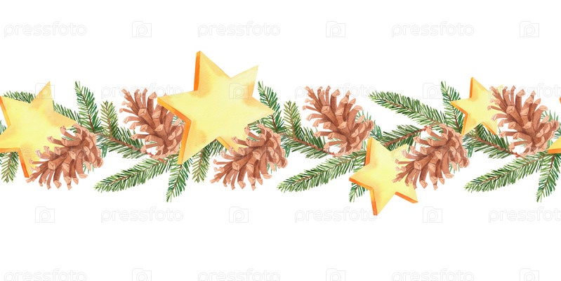 Бесшовная граница ветвей пихты, ягод, шишек и звезд пихты, обои, упаковочная бумага, поздравительные открытки, дизайн, декор и иллюстрации